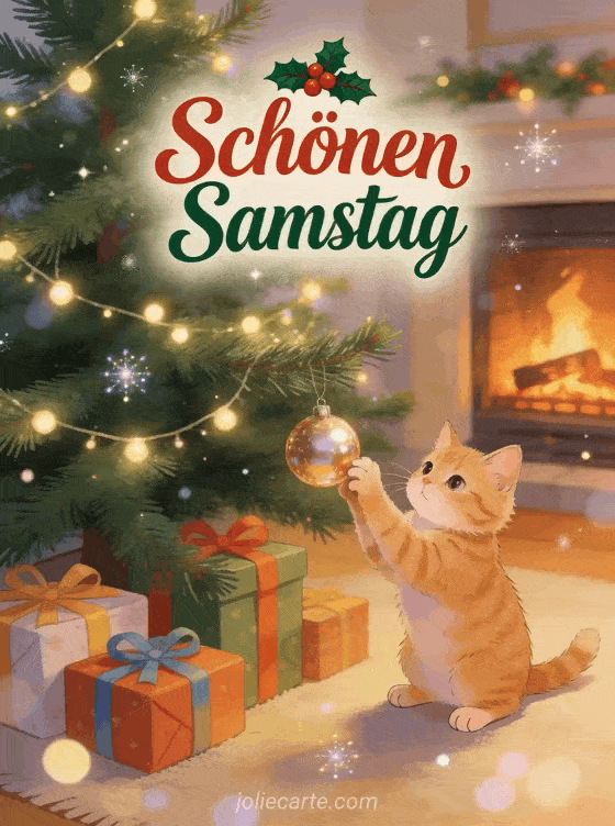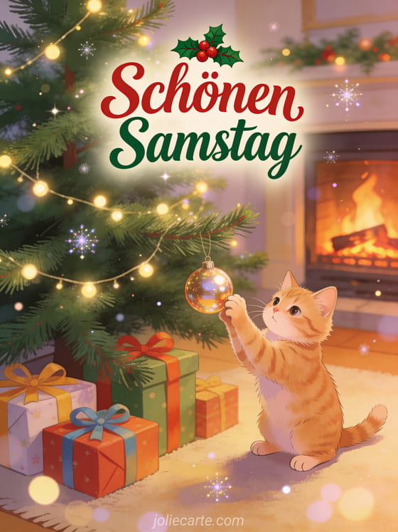 Teile eine warme Karte zu schönen Samstag Weihnachten mit roter und grüner Schrift, einem geschmückten Baum, einer süßen roten Katze, die mit einem Ornament spielt, eingepackten Geschenken und Kaminlicht. Entdecke auch Schönen Samstag lustige Bilder oder schönen Samstag mit Katzen.