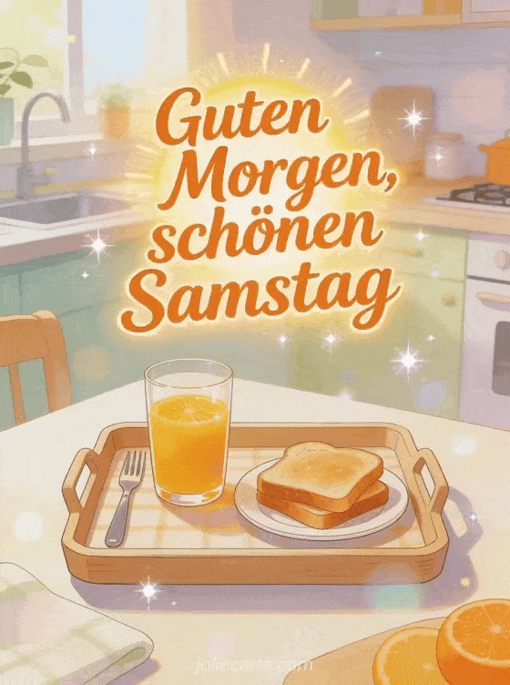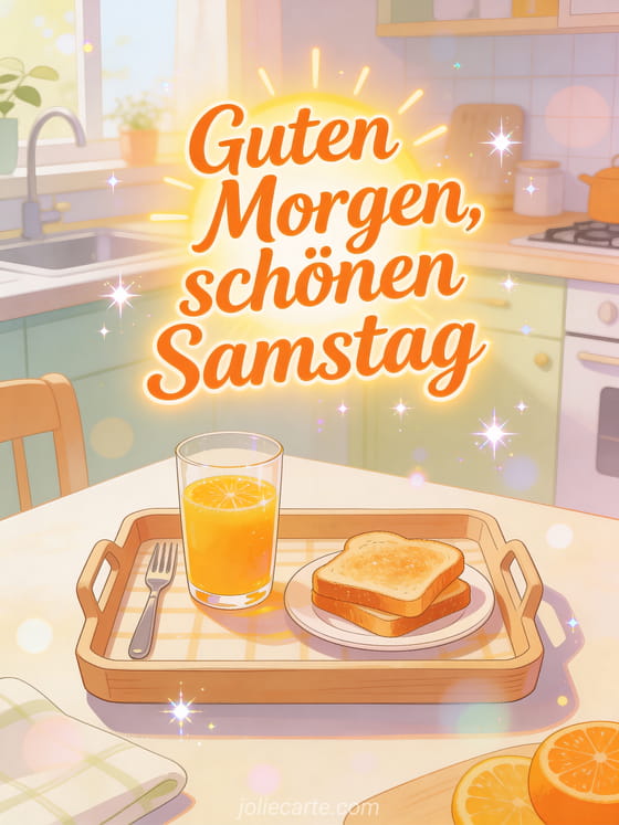 Teile guten Morgen schönen Samstag mit einem Frühstückstablett mit frischem Orangensaft und Toast in einer hellen Morgenküche. Starte ins Wochenende mit salam aleykoum schönen Samstag, Schönen Samstag Kaffee GIF oder GIFs Schönen Samstag.