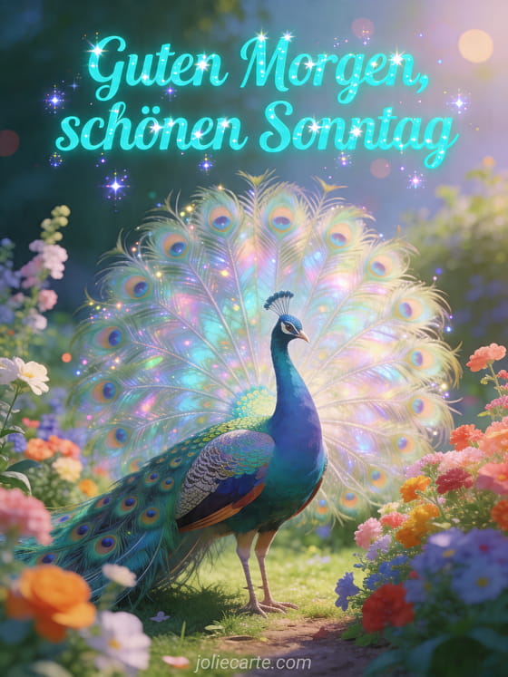 Wünsche einen leuchtenden Sonntag mit dieser bunten Karte, auf der ein wunderschöner Pfau sein prächtiges Federkleid in einem blühenden Garten zeigt. Entdecke auch schönen sonntag regen, schönen sonntag kostenloses bild oder gesegneten sonntag.