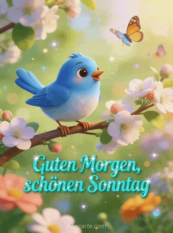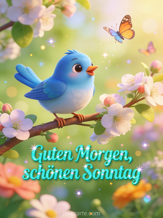 Teile einen hellen Sonntagsmorgengruß mit einer süßen Blaumeise, die auf einem Blütenzweig singt, Frühlingsblumen und tanzenden Schmetterlingen. Du kannst auch Schönen Sonntag und schönen Tag oder erholsamen Sonntag senden.