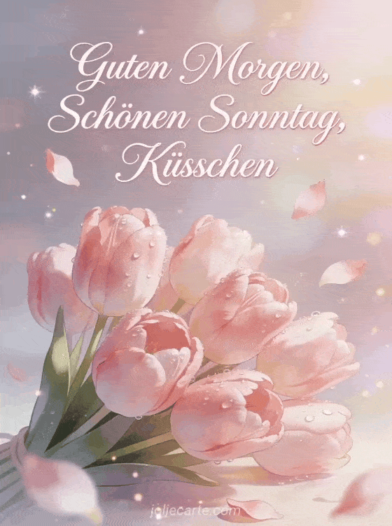 Starte jemandem den Sonntag mit Zärtlichkeit und Zuneigung mit dieser romantischen Karte mit einem wunderschönen Strauß rosa Tulpen mit Morgentau. Entdecke auch eine Karte schönen Sonntag lustiges GIF, eine Karte Schönen Sonntag Küsschen Bilder oder eine Karte einen wunderschönen Sonntag.