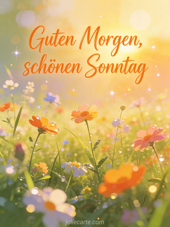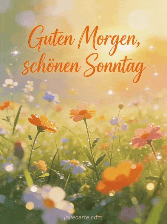 Teile guten Morgen schönen Sonntag mit einer Wildblumenwiese zur goldenen Stunde, auf der Morgentau im warmen Sonnenaufgang glitzert. Setze die Sonntagsstimmung fort mit Schönen Sonntag schönen Tag, schönen Sonntagabend oder lustiges Schönen-Sonntag-GIF.