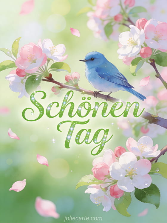 Sende einen frischen Gruß für einen schönen Tag mit einem charmanten blauen Vogel auf einem blühenden Apfelbaumast, umgeben von rosa und weißen Blüten. Entdecke auch schönen Mittwoch Eichhörnchen, Schönen Mittwoch animiertes GIF oder jeden Tag denke ich an dich yosa prod.