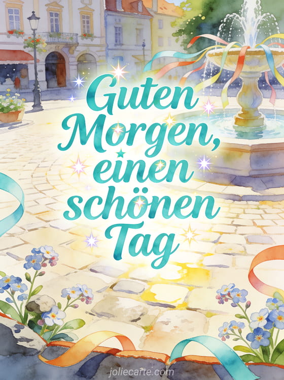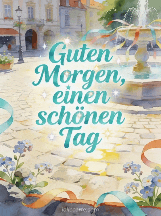 Teile guten Morgen, einen schönen Tag mit einem hellen Aquarell-Stadtplatzbrunnen, flatternden Schleifen, Blaukissenblüten und sonnigem Kopfsteinpflaster. Du kannst auch ein schönen Tag auch GIF, ein schönen tag fee gif oder ein Schönen Tag Küsse animiertes GIF senden.