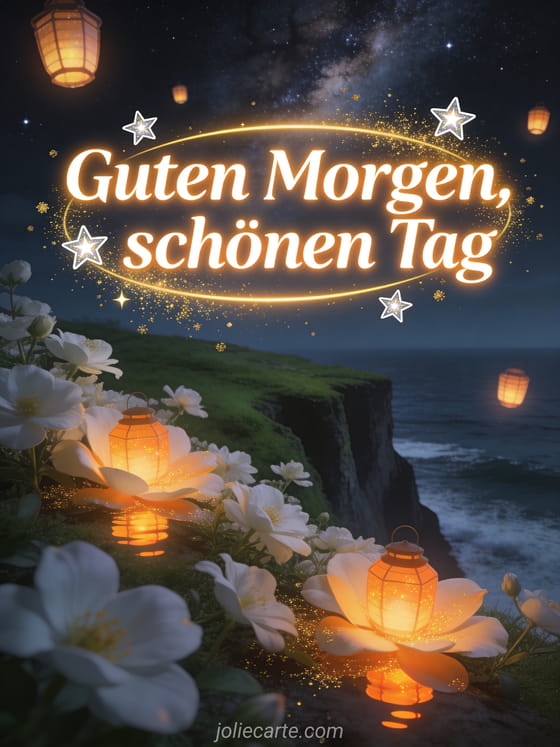 Beginnen Sie den Tag mit dieser bezaubernden Karte mit weißen Blumen auf einer grünen Klippe über dem Ozean, schwebenden Laternen am Sternenhimmel und der Milchstraße. Entdecken Sie auch eine Guten-Morgen-Karte mit Sonne oder eine Schönen-Tag-Karte.
