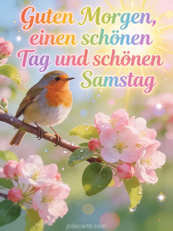 Teile einen fröhlichen Gruß zu Guten Morgen, schönen Tag und schönen Samstag mit einem glücklichen Rotkehlchen auf einem blühenden Apfelbaumzweig, Frühlings-Tautropfen und rosa Blüten. Entdecke auch ein Schönen Samstag Küsse Bild, Schönen Samstag Bild kostenlos oder eine kostenlose virtuelle Karte schönen Samstag.