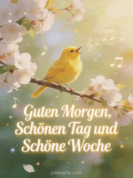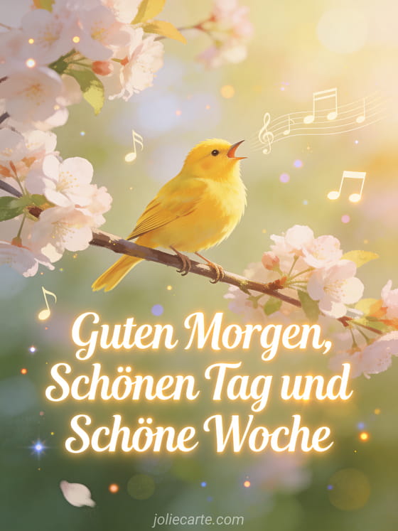WĂŒnschen Sie guten Morgen und eine schöne Woche mit dieser bezaubernden Karte, die einen gelben Kanarienvogel zeigt, der auf einem Ast mit KirschblĂŒten singt, wĂ€hrend Musiknoten umherschweben. Entdecken Sie auch eine guten morgen und schöne woche oder eine schöne woche humor.