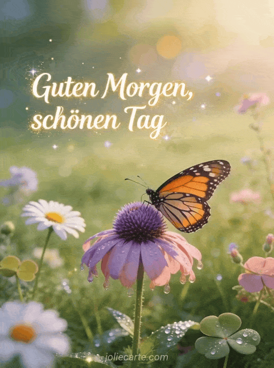 Teile einen Guten-Morgen-Schöner-Tag-Gruß mit dieser wunderschönen Monarchfalter-Garten-Karte. Entdecke auch sonnenschein schöner tag oder Nachricht guten Morgen schönen Tag.