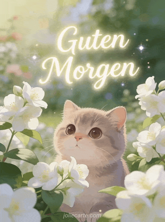 Eine süße und unwiderstehliche Guten Morgen Karte mit einer entzückenden British Shorthair Katze mit großen runden Augen zwischen weißen Jasminblüten in einem romantischen Morgengarten. Entdecke auch eine Guten Morgen Karte, ein animiertes Guten Morgen GIF oder einen Guten Morgen Spruch Frühaufsteher.