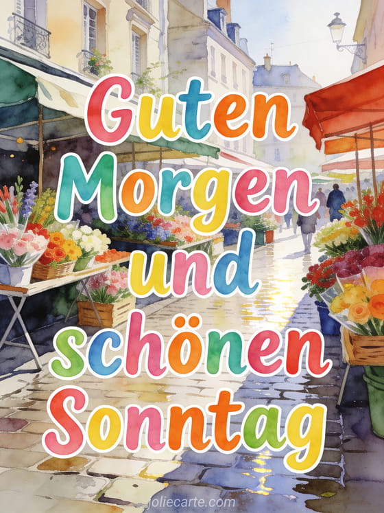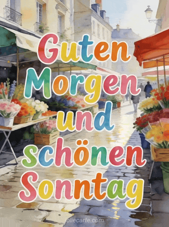 Teile einen hellen Sonntagmorgen-Gruß mit einem lebendigen Blumenmarkt, bunten Sträußen und frischem Stadtlicht. Entdecke auch schönen Sonntag mein Schatz Küsse, schönen Sonntag animiert oder animierte Marienkäfer schönen Sonntag GIFs.
