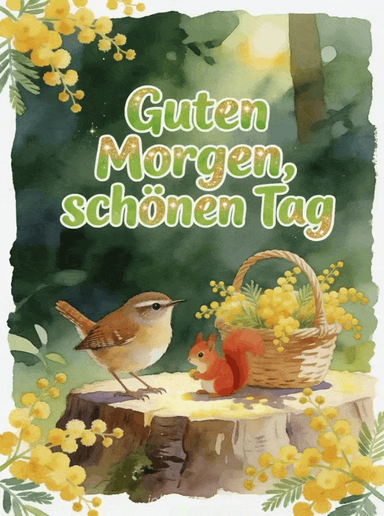 Senden Sie eine Guten Morgen Tiere Karte mit einer fröhlichen Waldszene, einem kleinen Zaunkönig, einem roten Eichhörnchen und sonniger Mimose. Teilen Sie auch eine emilia-romagna karte, eine berührende Guten-Morgen-Nachricht für meine Frau oder guten morgen lustig.