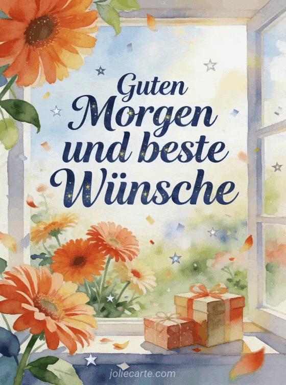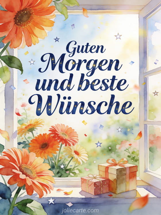 Sende eine festliche Guten-Morgen-Karte mit elegantem tiefblauem Aquarellschriftzug, leuchtenden Gerbera, verpackten Geschenkboxen und schwebendem Sternkonfetti in einem Fenstergarten. Entdecke auch eine kleine Nachricht zum Guten Morgen, eine Guten Morgen Nachricht an ihren Liebsten oder eine virtuelle Guten-Morgen-Karte.