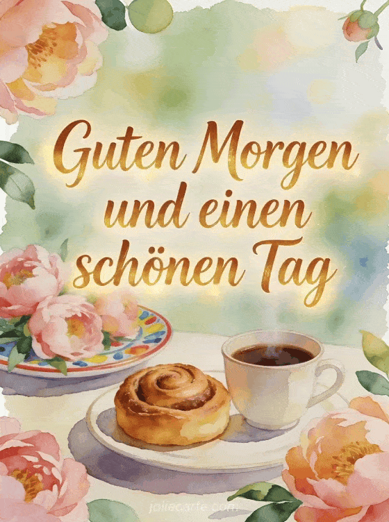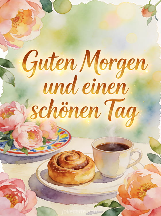 Teile eine süße Morgenstimmung mit einer Zimtschnecke neben einer dampfenden Kaffeetasse, üppigen Pfingstrosen und einem fröhlichen Keramikteller in sanftem Aquarelllicht. Dazu passen Guten Morgen Kaffee GIF Kaffee, ein Guten Morgen Kaffee Bild oder ein Guten Morgen Kaffee Blumen Bild.