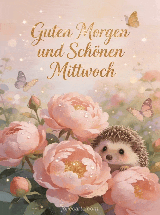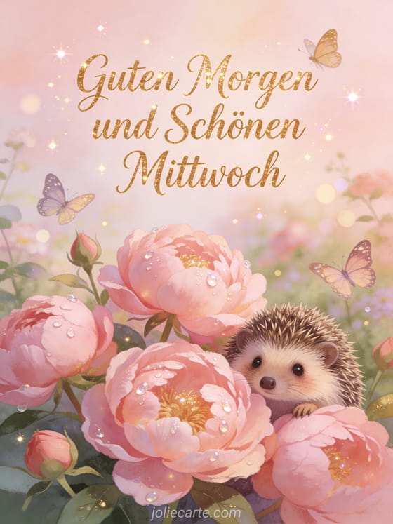 Wünschen Sie einen guten Morgen und schönen Mittwoch mit dieser bezaubernden Grußkarte. Ein niedlicher Igel lugt hinter rosa Pfingstrosen hervor, während Tautropfen im Morgenlicht glitzern. Entdecken Sie auch eine Schönen Mittwoch Karte oder eine Mittwochsgruß mit Küsschen Karte.