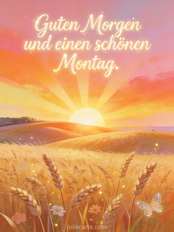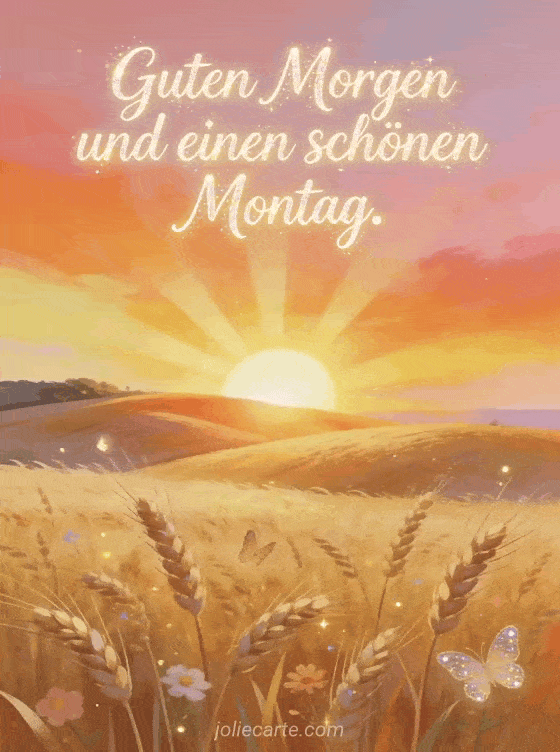 Sende guten Morgen und einen schönen Montag mit einem Sonnenaufgang hinter sanften Weizenfeldern, einem leuchtenden Himmel und weichen Lichtstrahlen. Entdecke auch kostenlose Schönen-Montag-Karten, schönen Montag und gute Woche Bild oder schönen Montag Küsschen GIF.