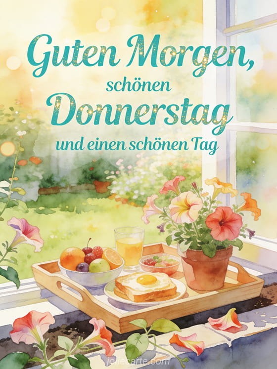 Teile Guten Morgen und schönen Donnerstag mit einem hellen Frühstückstablett, Obst, Petunien und einem sonnigen Fenstergarten in warmem Aquarelllicht. Entdecke auch es regnet schönen Donnerstag im Regen, angenehmer Donnerstag Küsschen oder schöne Bilder für schönen Donnerstag.