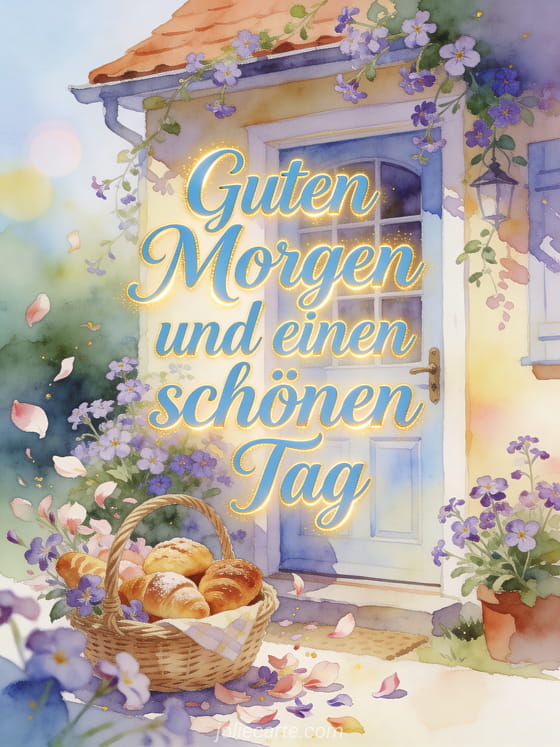 Teile einen warmen Guten-Morgen-und-schönen-Tag-Gruß mit einem hellen Cottage-Eingang, Blaukissenblüten und einem Weidenkorb voller frischem Gebäck. Entdecke auch schönen sonnigen Tag Text, Guten Morgen schönen Tag schöne Bilder oder schönen Tag und schönes Wochenende Bilder.
