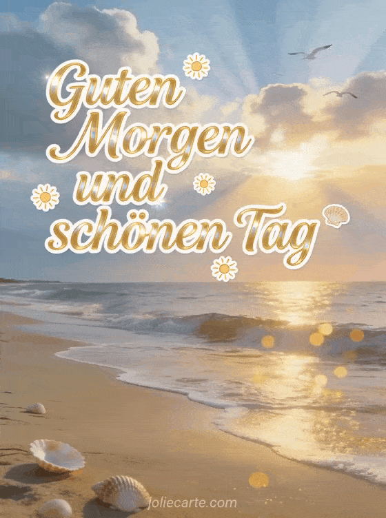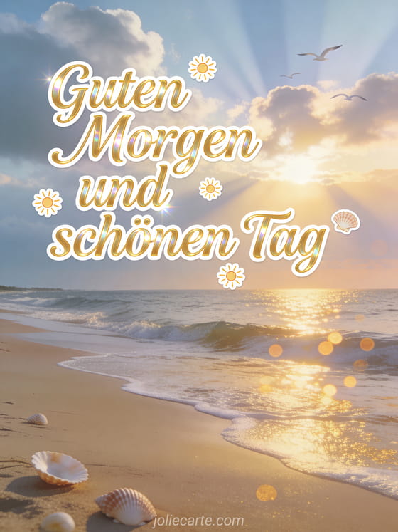 Beginnen Sie den Tag mit dieser atemberaubenden Karte mit einem Sandstrand bei Sonnenaufgang, sanften Wellen, spektakulären Sonnenstrahlen und goldenem Bokeh auf dem Wasser. Entdecken Sie auch eine virtuelle Guten-Morgen-Karte oder eine Schönen-Tag-Karte mit Küsschen.