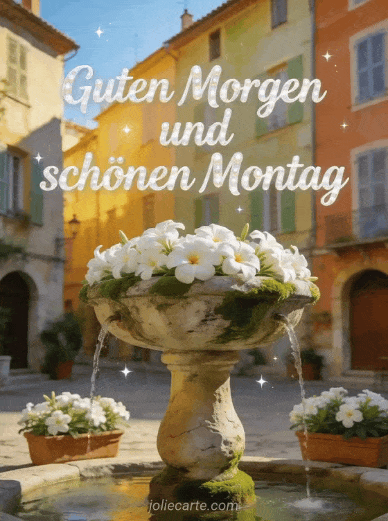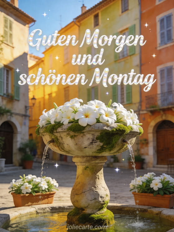 Verschicke einen hellen Montagsgruß mit einem provenzalischen Platz, einem Steinbrunnen und sanftem goldenen Morgenlicht. Entdecke auch animierte schönen montag gifs, schönes wochenende bis montag und schönen montag in bildern.
