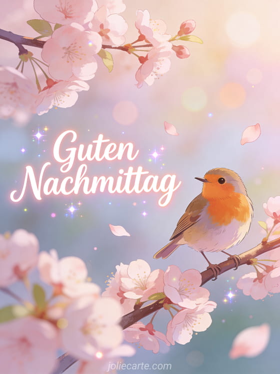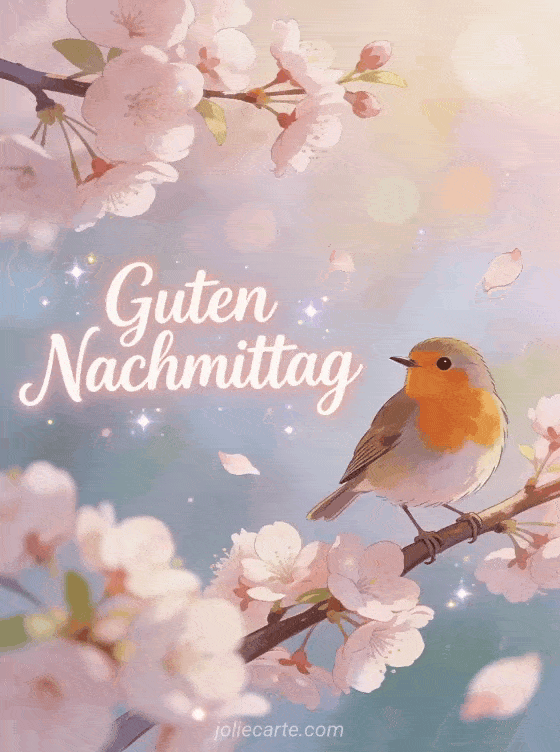 Verschicke einen wunderschönen Guten-Nachmittag-Gruß mit einem Rotkehlchen auf blühenden Kirschblüten. Entdecke auch ein Bild Guten Nachmittag, Bilder Guten Nachmittag oder ein Bild Guten Nachmittag mein Herz.