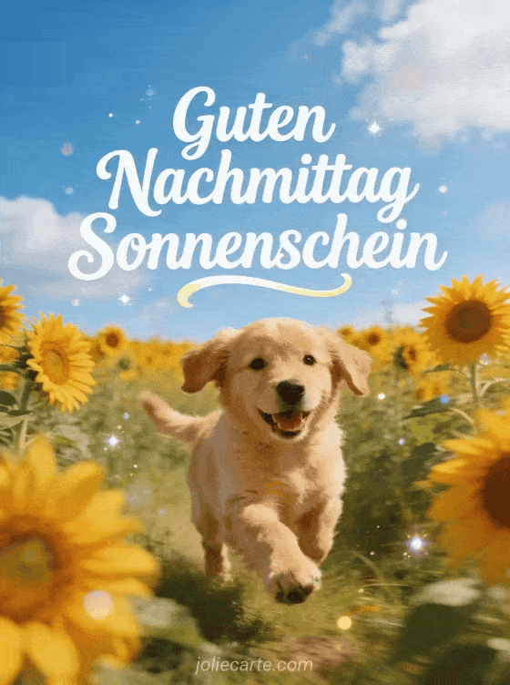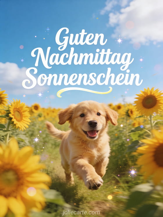 Eine Karte voller Freude und Energie mit einem glücklichen Golden Retriever Welpen, der an einem sonnigen Nachmittag durch ein strahlendes Sonnenblumenfeld läuft. Entdecke auch ein Guten Nachmittag GIF kostenlos, ein witziges Guten Nachmittag GIF oder ein Guten Nachmittag Kätzchen Bild.