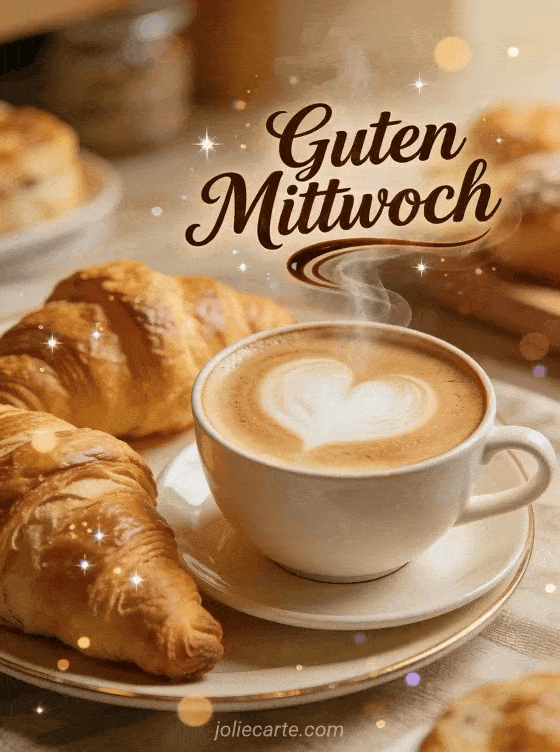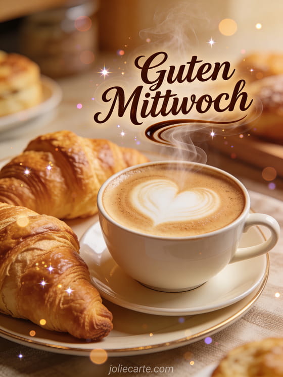 Starte den Mittwoch mit dem Gefühl von warmem Kaffee und Croissants dank dieser gemütlichen Karte. Entdecke auch eine Karte guten Morgen Mittwoch oder eine Karte guten Morgen Mittwoch zen.