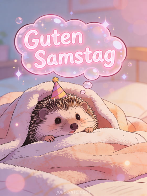 Teile eine urkomische Guten-Samstag-Karte mit Humor mit einem entzückenden Igel in einem kleinen Partyhut, der aus einem gemütlichen Deckenberg schaut. Die perfekte faule Wochenendmorgenkarte. Entdecke auch eine Karte einen schönen Samstag oder eine Karte Samstag Landschaft.