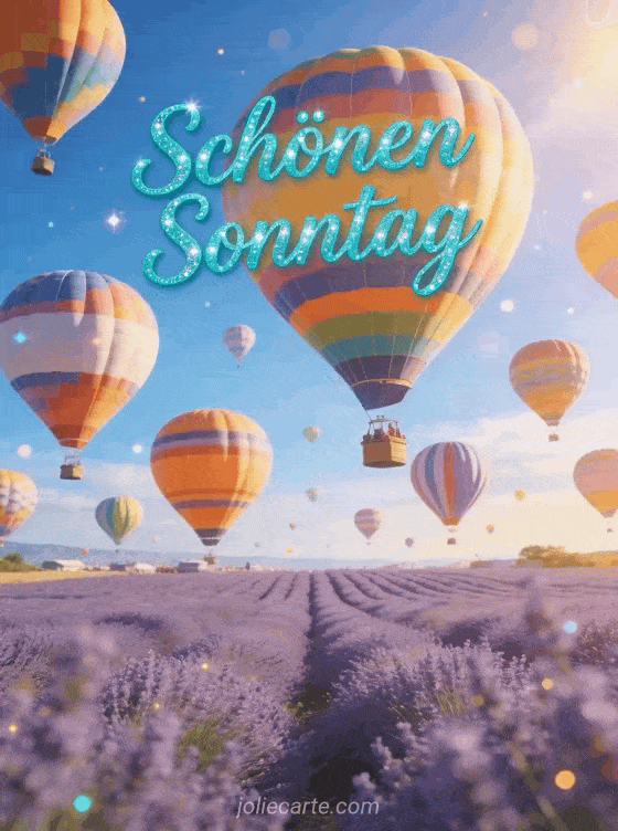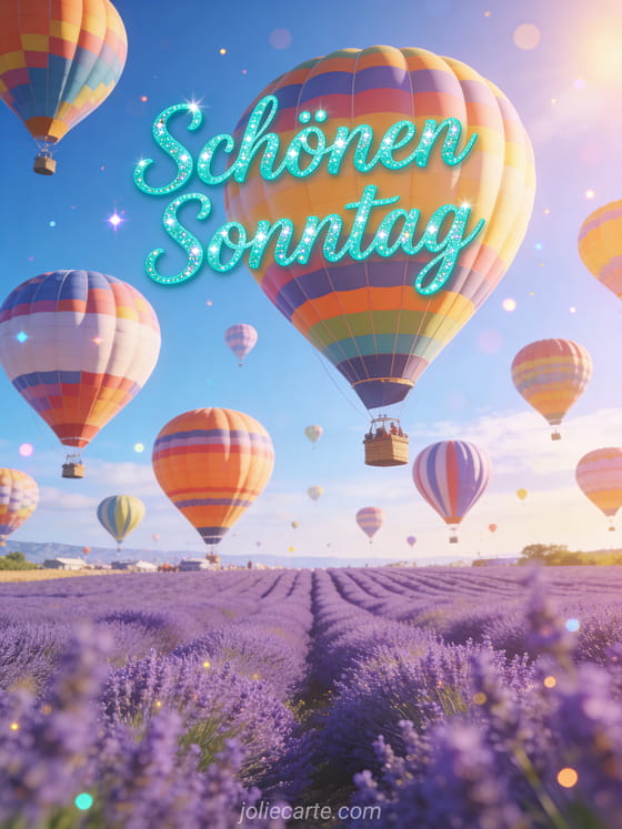 Teile einen leuchtenden Sonntagsgruß mit türkisfarbener Schrift, bunten Heißluftballons über Lavendelfeldern, blauem Himmel und sommerlicher Abenteuerstimmung nach Provence-Art. Entdecke auch Schönen Sonntag lustiges gif oder einen schönen Sonntag wünschen.