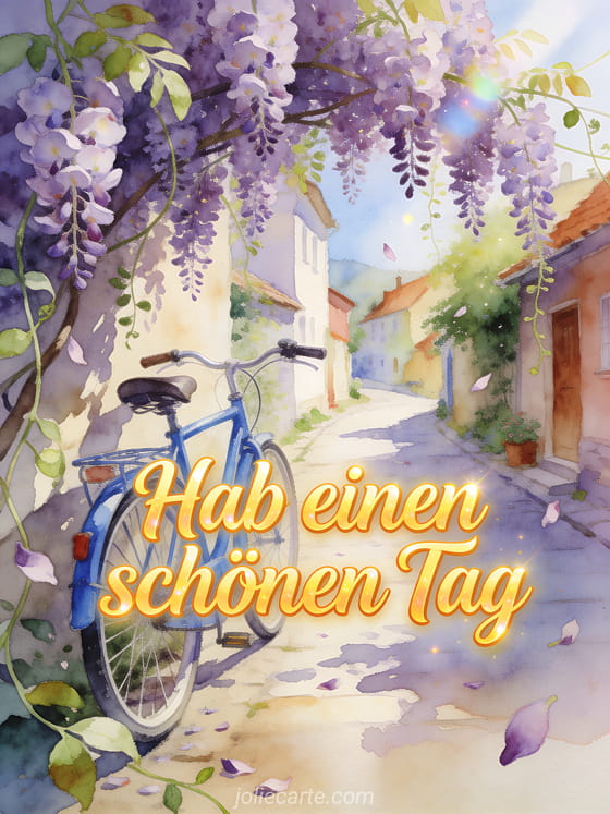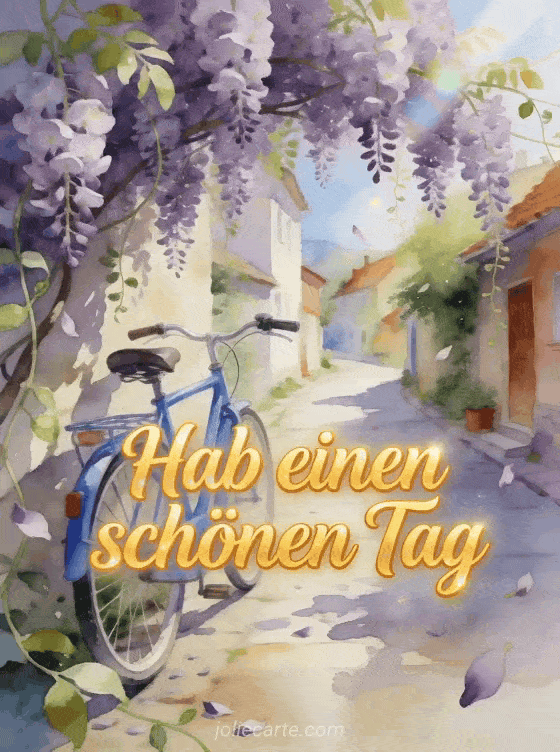 Wünsche einen schönen Tag mit einer charmanten Dorfgasse, Glyzinienblüten über einem blauen Fahrrad und frischen Aquarellfarben. Du kannst auch Fotos GIF schönen Tag, animierte GIFs Küsschen schönen Tag oder ein schönen sonnigen Tag GIF senden.