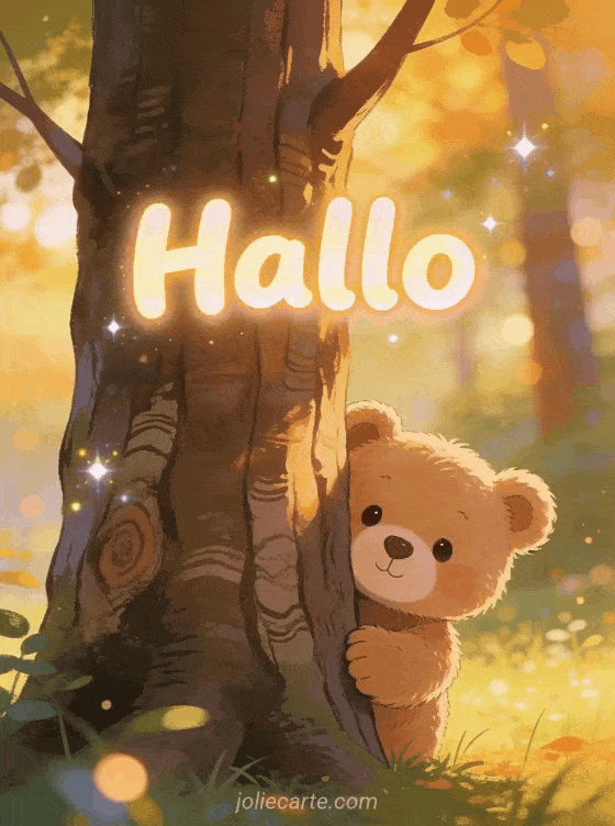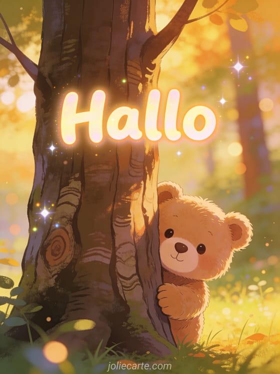 Sende dieses bezaubernde Hallo mit einem süßen Teddybären der hinter einem Baum in einem sonnigen Waldlichtung hervorlugt. Entdecke auch eine Karte Eule Hallo oder eine Karte Hallo kleiner Wellensittich gif.
