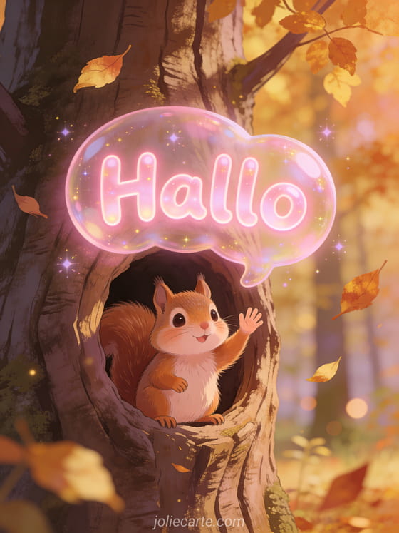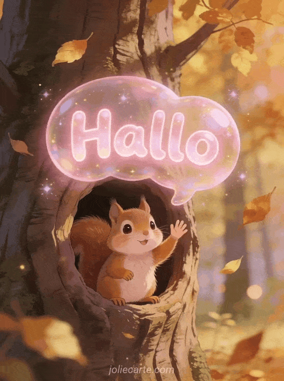 Teile ein fröhliches animiertes Hallo gif mit einem niedlichen Eichhörnchen das im Herbstwald winkt. Entdecke auch eine Hallo Kind Karte oder eine gif Hallo Küsschen Karte.