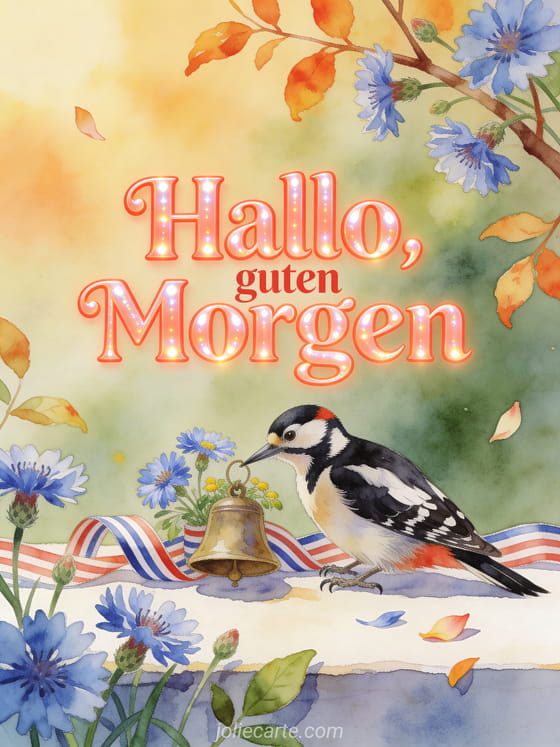 Teile einen fröhlichen Morgengruß mit dieser Aquarellkarte, auf der ein Buntspecht bei einem kleinen Glöckchen zwischen Kornblumen und gestreiften Schleifen sitzt. Entdecke auch huhu schönen Abend png, Guten Morgen und hallo oder oh hallo.