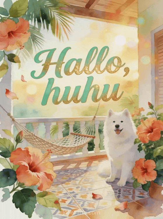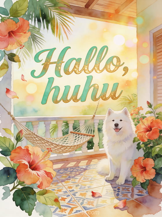 Sende Hallo Huhu GIF mit mintgrüner Aquarellschrift, einem Samojede neben Hibiskusblüten, gemusterten Fliesen, einer gewebten Hängematte und warmem Sonnenaufgangslicht auf einer tropischen Terrasse. Du kannst auch eine Karte für süßes Huhu Küsschen GIF, eine Karte für schöner Tag Huhu Guten Morgen GIF oder eine Karte für Huhu guten Morgen GIFs teilen.