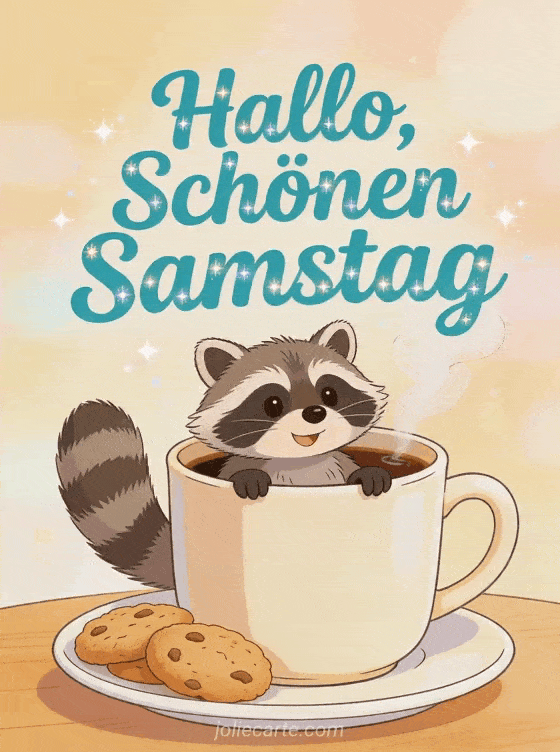 Teile mit dieser kostenlosen Karte ein fröhliches Hallo, Schönen Samstag mit einem frechen Waschbär, der aus einem großen Kaffeebecher neben Keksen hervorschaut. Entdecke auch gif schönen samstag, lustige animierte schöner samstag gifs gif oder bild wunderschönen samstag.