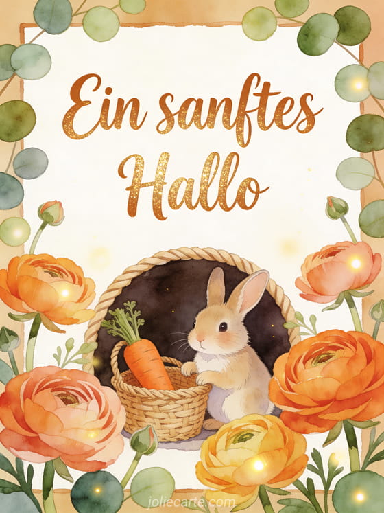 Teile ein sanftes Hallo mit einem kleinen Hasen neben einem geflochtenen Karottenkorb, gerahmt von Ranunkelblüten und runden Blättern in warmen Aquarellfarben. Du kannst auch Morgen ein kleiner Gruß Küsse, Nachricht ein kleiner Gruß Küsse oder ein Huhu du Küsschen Bild senden.