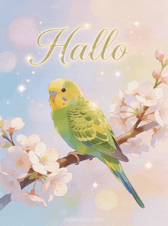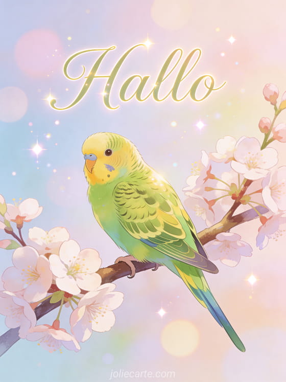 Schicke ein süßes Hallo mit dieser kostenlosen Karte mit einem grün-gelben Wellensittich auf Kirschblütenzweigen. Entdecke auch einen Hallo Sonnenschein oder ein schönes Hallo.