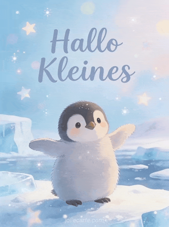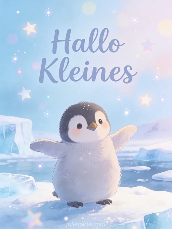 Teile eine entzückende Hallo Kleines Karte mit einem Baby-Pinguin, der seine winzigen Flügel in einer verschneiten Antarktis-Szene mit weichem blauen Eis schlägt. Entdecke auch eine Hallo kleiner Sittich Karte, eine Hallo Sonnenschein Karte oder eine schönes Hallo Karte.