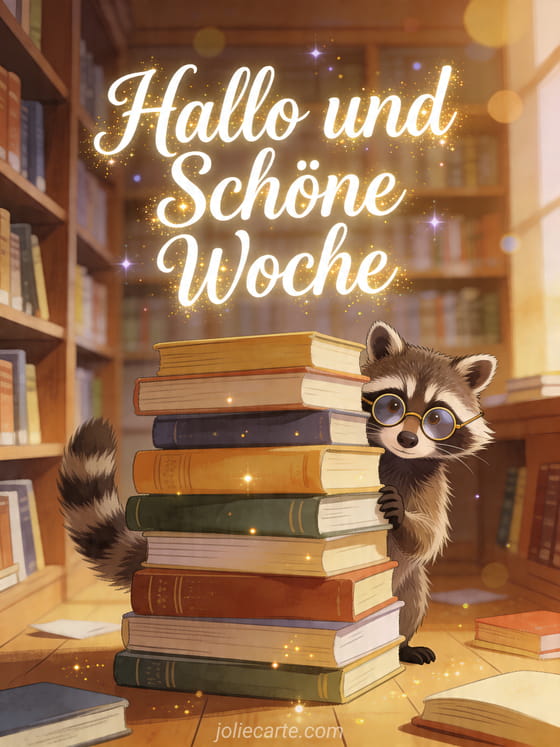Teile mit dieser kostenlosen Karte ein lustiges Hallo und schöne Woche mit einem frechen Waschbär mit kleiner runder Brille hinter einem Bücherstapel. Entdecke auch lustig schöne woche, hallo und schöne woche euch allen oder bild hallo und schöne woche.