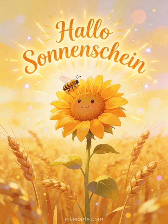 Teile eine schöne Hallo Sonnenschein Karte mit einer fröhlichen Sonnenblume und einer lächelnden Biene in einem leuchtenden Sommerfeld mit goldenem Weizen. Entdecke auch eine schönes Hallo Karte, eine Hallo Fotos Karte oder eine Hallo Küsschen Karte.