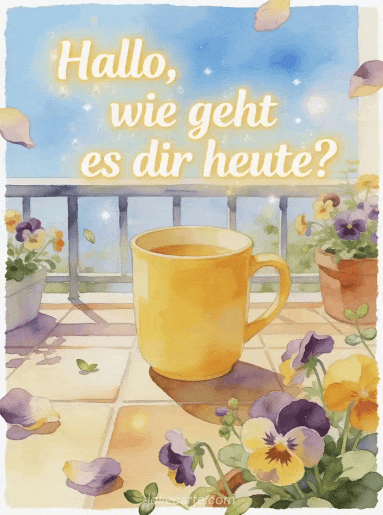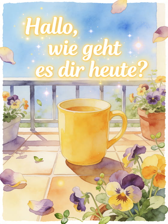 Zeige Aufmerksamkeit mit einer sonnigen Aquarellkarte: Stiefmütterchen um einen fröhlichen gelben Becher in einem gefliesten Balkongarten. Dazu passen geht es dir gut mein schatz, wie geht es dir mein schatz sms oder hallo wie geht es dir.