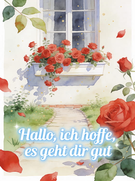 Zeige Aufmerksamkeit mit einer klaren Aquarellszene aus roten Rosen, die aus einem hellen Blumenkasten über einen kleinen Gartenweg fallen. Dazu passen wie geht es dir mein kleiner Schatz, geht es dir gut mein Sohn oder hallo mein Schatz wie geht es dir.