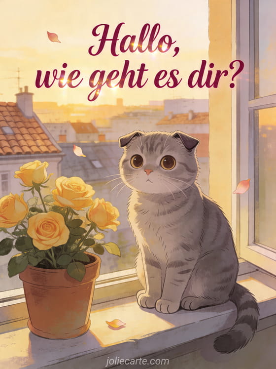 Melde dich mit dieser zarten Karte voller Wärme, auf der eine graue Scottish Fold Katze auf einer Fensterbank neben gelben Rosen im goldenen Spätnachmittagslicht sitzt. Entdecke auch hallo wie geht's, guten Morgen wie geht es dir oder wie geht es dir.