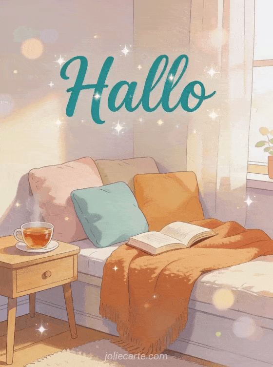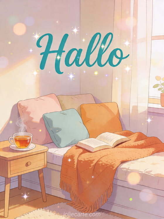 Teilen Sie diese beruhigende Karte Hallo mit einer gemütlichen Leseecke, weichen Kissen, warmer Decke und einer Tasse Tee. Entdecken Sie auch hallo mama, sms guten morgen freundschaftlich und meme guten morgen.