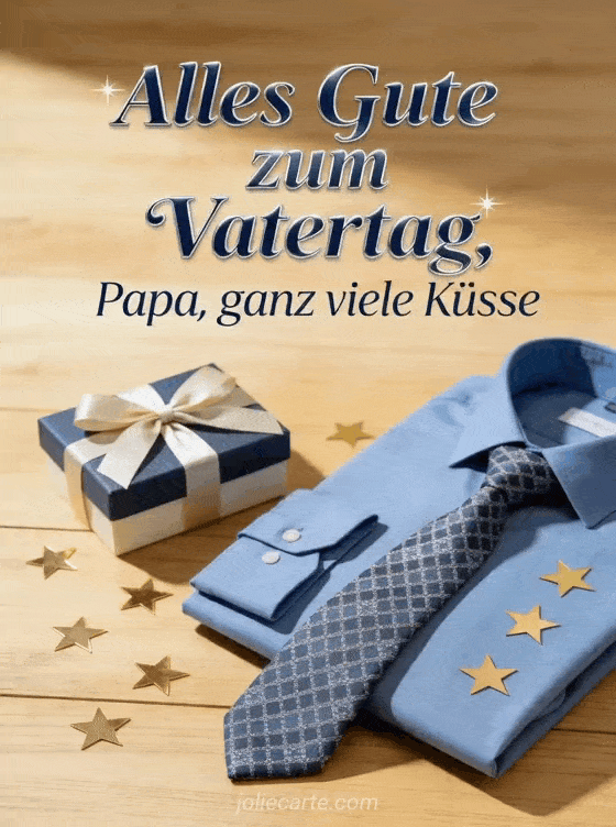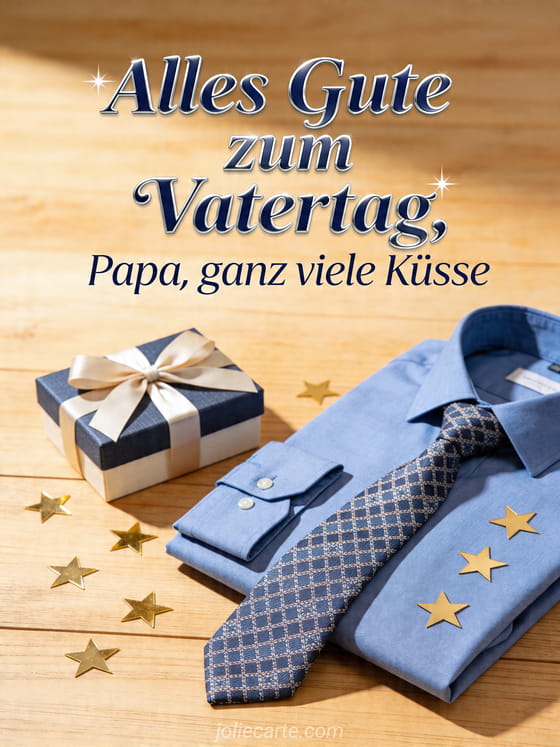 Feiere Papa mit einer warmen, eleganten Karte mit blauem Hemd, Krawatte, Geschenk und goldenen Sternen. Diese Grußkarte passt perfekt, um zum Vatertag viele liebe Küsse zu senden. Entdecke auch eine Vatertagskarte.