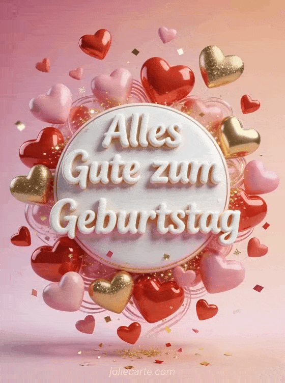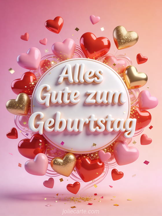 Sende einen fröhlichen romantischen Geburtstagsgruß mit weißer verspielter Schrift, umgeben von vielen roten, rosa und goldenen Herzen. Glänzende 3D-Herzen, goldener Glitzer und Konfetti schaffen eine helle festliche Karte. Entdecke auch Alles Gute zum Geburtstag mein Herz Bilder, Alles Gute zum Geburtstag mein Schatz oder ein Geburtstagsbild für meinen Liebling.