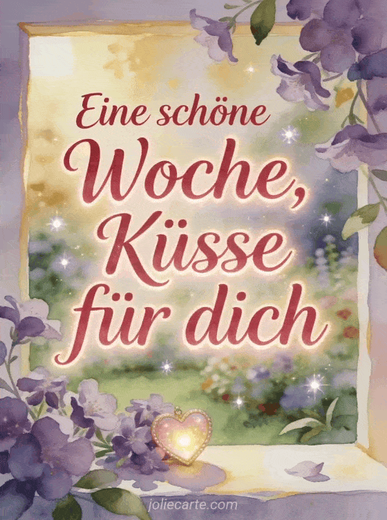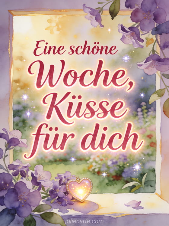 Teile eine sanfte Wochenbotschaft mit karmesinroter Kalligrafie, einem leuchtenden Herz, Veilchen und warmem Gartenlicht. Entdecke auch schöne Bilder schöne Woche Küsse, Küsse Zärtlichkeit schöne Woche oder schöne Woche euch allen Küsschen Bilder.