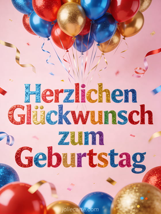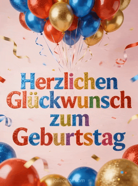 Senden Sie dieses festliche Herzlichen Glückwunsch GIF mit mehrfarbigen Glitter-Buchstaben, einem Ballon-Schauer und fliegenden Schleifen. Entdecken Sie auch das gif alles gute zum geburtstag oder eine alles gute zum geburtstag Karte.