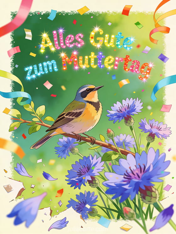 Feiere mit dieser farbenfrohen Heute ist Muttertag Karte. Ein Grünfink sitzt auf blühenden Kornblumen in einer festlichen Szene mit buntem Konfetti und Luftschlangen. Entdecke auch einen Muttertag Glückwunsch oder eine Muttertagsgrußkarte.