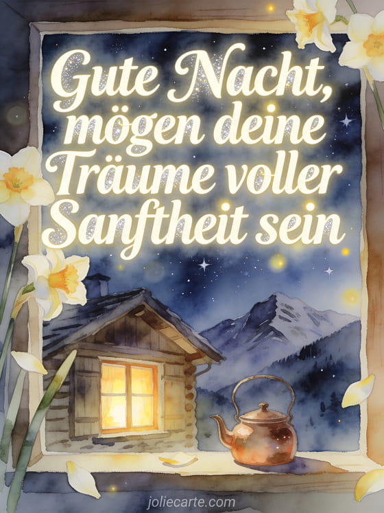 Teile eine zarte Gute-Nacht-Nachricht mit Narzissenblüten, einem leuchtenden Fenster eines Bergchalets, einem kleinen Kupferkessel und einem Sternenhimmel in Aquarell. Entdecke auch Gute-Nacht-Nachricht für sie, Nachricht um deinem Schatz gute Nacht zu sagen oder Karte um gute Nacht zu sagen.