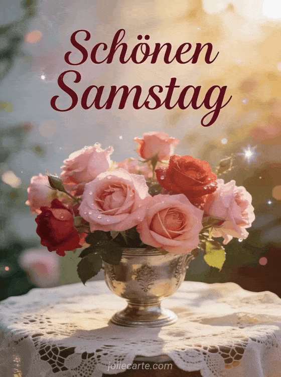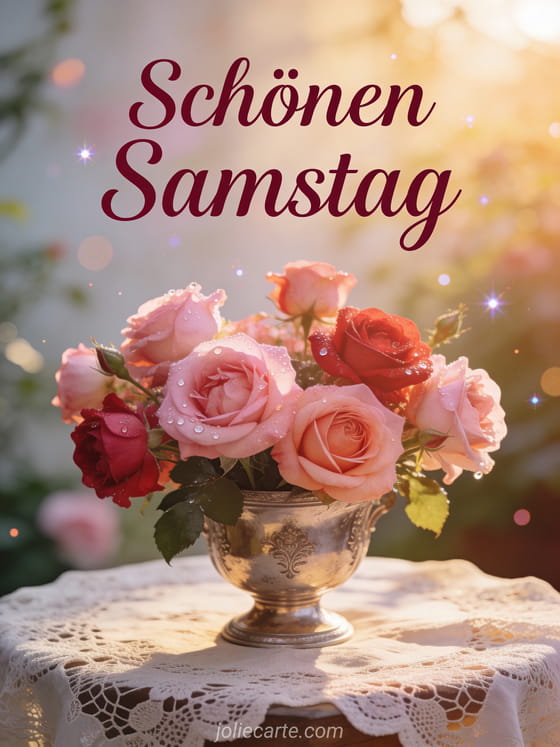 Teile einen eleganten Samstaggruß mit dieser wunderschönen Karte mit Gartenrosen in einer antiken Silbervase. Entdecke auch eine guten morgen schönen samstag und schönes wochenende Karte oder eine samstag schönen tag Karte.